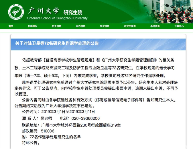 72名研究生在學校規定的最長學習年限(博士7年、碩士5年,下同)內未完成學業,學校決定對這72名研究生作退學處理。