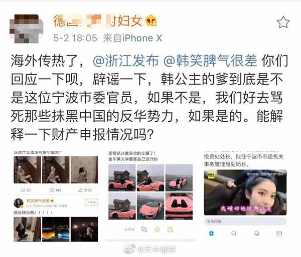 5月10日下午,北青報記者聯繫到韓笑的母親趙女士。趙女士稱,已看到網絡上的不實信息,稱自己的家庭並非網傳的“寧波首富”,丈夫也不是寧波官員韓彭軍。“我們就是普普通通的一家人,網上誇大了,哪裏稱得上是寧波首富。我做生意二十多年,女兒畢業了,給她買一輛車、一套房也是人之常情。”