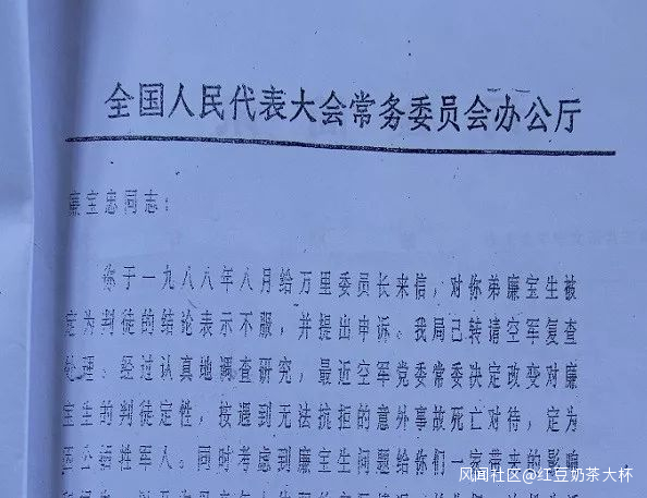 1988年8月,廉寶忠寫信給全國人大常委會委員長萬里。兩年後的11月,他收到回覆:空軍黨委決定改變對廉寶生的叛徒定性,按遇到無法抗拒的意外事故死亡對待,定為因公犧牲軍人,給你們一次性生活補助費1萬元。