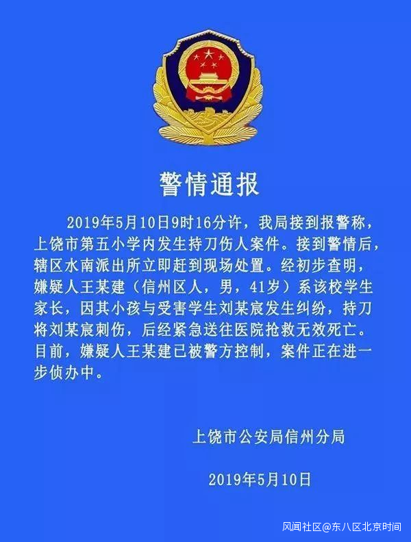 據警方通報,這起5月10日發生在江西上饒市第五小學的持刀傷人案件,起因是學生家長王某建的女兒,與同學劉某宸發生糾紛。於是他持刀將10歲男孩劉某宸刺死。該家長傷人後並未離開,直至警方將其帶走。