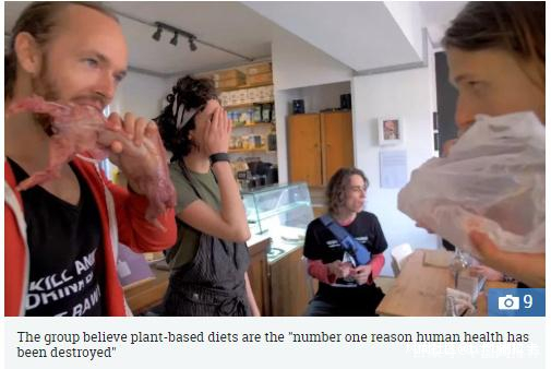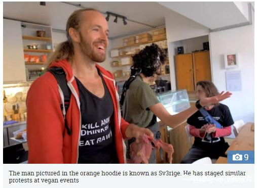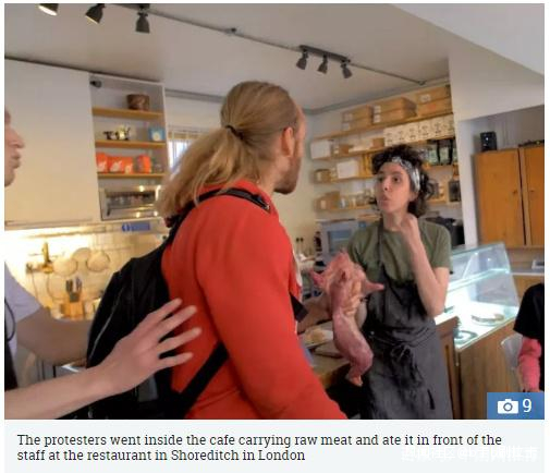 據悉,這是一場有組織的抗議。上個月,一羣肉食主義者走進了一家素食餐廳,其中一個人開始生吃剝了皮的松鼠。另一名成員則坐在旁邊,從包裏掏出一塊血淋淋的生肉,塞進嘴裏。