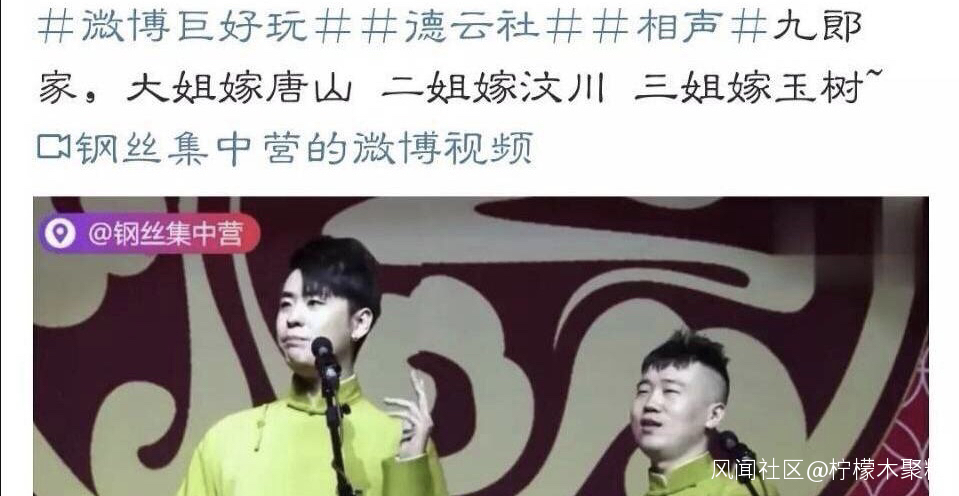 在這段相聲中張雲雷説楊九郎大姐嫁唐山、二姐家汶川、三姐嫁玉樹。楊九郎説三個人有造化,是倖存者,是挑戰極限,是貝爾。