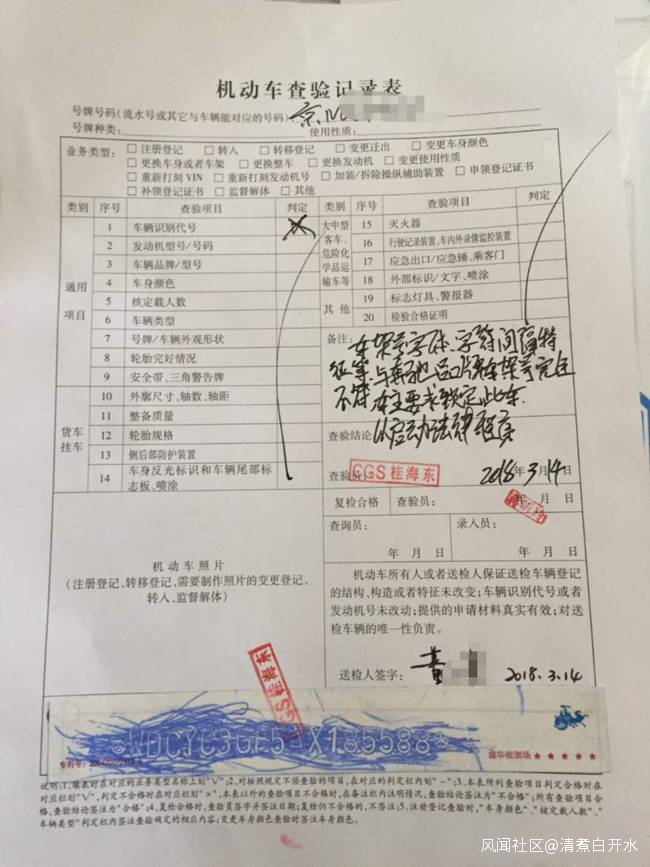 2018年3月14日,董先生將其奔馳車開到北京盛華檢測場進行檢測時,在查驗項目的第1項——車輛識別代號,就被打“X”。查驗員備註:車架號字體、字符間隔特徵等,與奔馳品牌車架號完全不符。