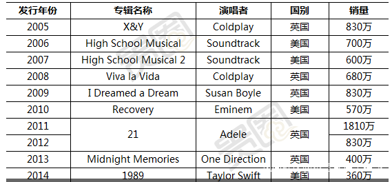 我們看這是美國唱片銷量也是在一路下滑。除了2011年阿黛爾的2首神專輯震驚了世界,現在美國最當紅的歌手黴黴泰勒斯威夫特,唱片銷量也就300多萬。