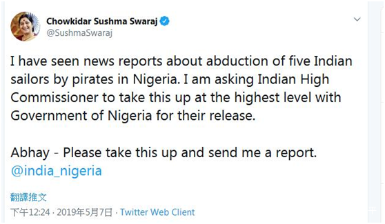 印度外長斯瓦拉傑5月7日發表推特説,她已經看到有關5名印度船員在尼日利亞被海盜綁架的新聞,自己正要求印度高級專員與尼日利亞政府最高層就船員獲釋一事進行溝通。