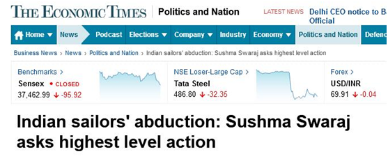 據印度《經濟時報》報道,4月29日,遭綁架船員之一的庫馬爾·喬杜裏的妻子達斯在她的推特上喊話印度外長斯瓦拉傑。她説,斯瓦拉傑女士,請調查此事,已經超過10天了,但還沒有任何消息。“我們甚至不知道他們在哪裏,他們怎麼樣……請救救我的丈夫。”
