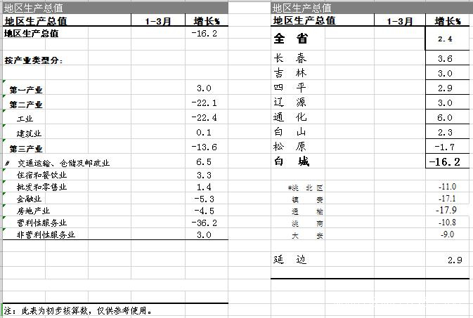 近日,吉林省白城市統計局在市政府官網公佈了《2019年地區生產總值1-3月》季報,報表顯示,據初步核算,今年1至3月白城市生產總值增長率為-16.2%。其中,該市第一產業增長3%,第二產業和第三產業的增長率分別為-22.1%和-13.6%。