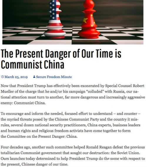 如果説這種説法還算委婉含蓄,那麼與CPDC密切相關的極右翼智庫美國“安全政策中心”則替它傳達了更簡單粗暴的意圖:“既然總統川普已被穆勒特別委員會證實並未通俄,我們國家的注意力就應該相應轉向一個更為危險和具有侵略性的敵人:中國。為了解並反擊中國共產黨和中國造成的威脅,數十名國家安全從業者,中國專家,商界領袖,人權和宗教自由活動家共同組成應對中國危險委員會。40年前,另一個這樣的委員會幫助里根擊敗了前極權主義共產黨政府:蘇聯。我們今天組建這個委員會就是為了應對來自中國的威脅,幫川普總統做同樣的事情。”