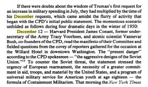 他們指出當時的危險在於:蘇聯的侵略性計劃(the aggressive designs of SovietUnion),併為此積極推動保羅·尼澤(Paul Nitze)撰寫的絕密NSC-68號文件當中的計劃。