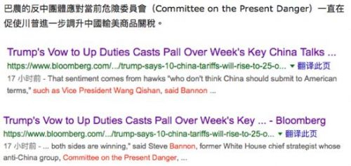 (彭博社曾發文提及“班農的CPDC督促川普進一步調升中國輸美關税”。)