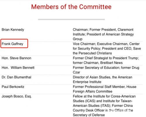 該委員會共有43名成員,大都是川普的狂熱支持****者、保守派智庫成員以及前國防和情報官員,包括里根總統時期的教育部長威廉·班奈特,小布什總統時期的國防部副部長威廉·博伊金(William G. Boykin),賓夕法尼亞大學國際關係和中國歷史教授華德隆(Arthur Waldron),戰略防禦專家亨利·庫玻(Henry Cooper),太平洋艦隊前情報總監法內爾(James Fanell)。此外,還有幾個濫竽充數者,這裏就不提了。