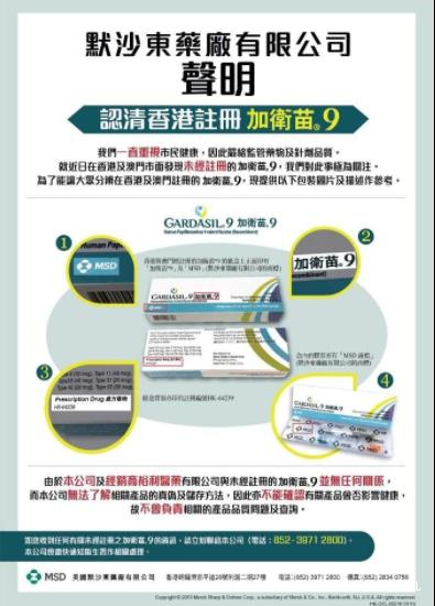 藥廠在5月10日《明報》、《東方日報》、《星島日報》等多家香港主要報紙刊登頭版廣告,再次發出聲明,提醒市民應留意近日在香港及澳門市面發現的未經註冊疫苗,認清香港註冊的“GARDASIL®9加衞苗®9”,上的四個防偽特徵。