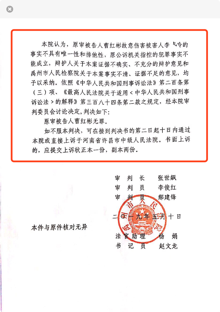 最終,禹州法院判決原審被告人曹紅彬無罪。