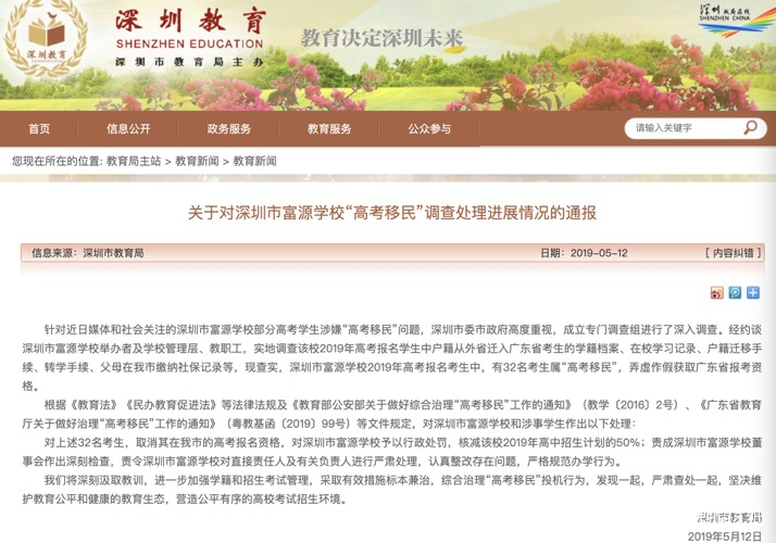 5月12日晚11時57分,深圳市教育局發佈通報稱,深圳市富源學校2019年高考報名考生中,有32名考生屬“高考移民”。對此,深圳市教育局將取消這些考生在深圳市的高考報名資格,核減富源學校2019年高中招生計劃的50%。