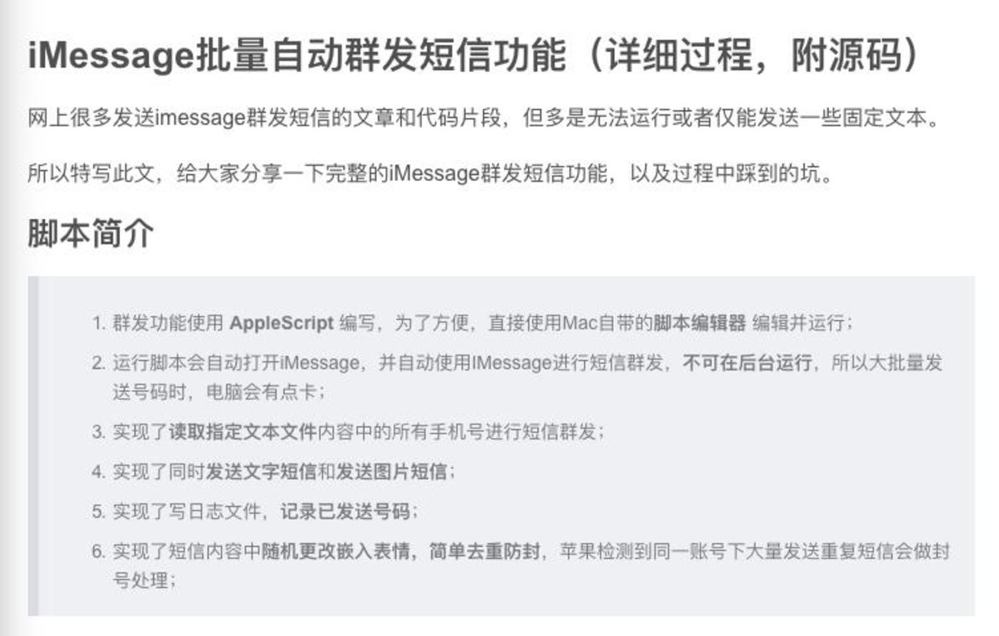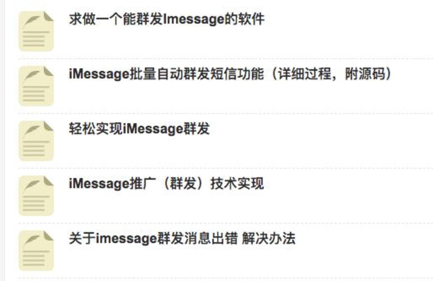 懂懂筆記在搜索引擎上搜索“iMessage羣發”,找到了不少相關的技術貼。而在某IT技術社區,不少相關內容甚至詳盡提供了Apple 編寫的羣發代碼與教程。