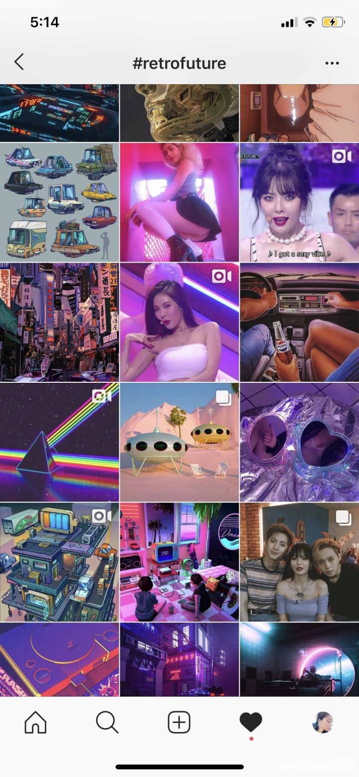 今年也很流行retrowave,可以先上Instagram搜索一下大概配色: