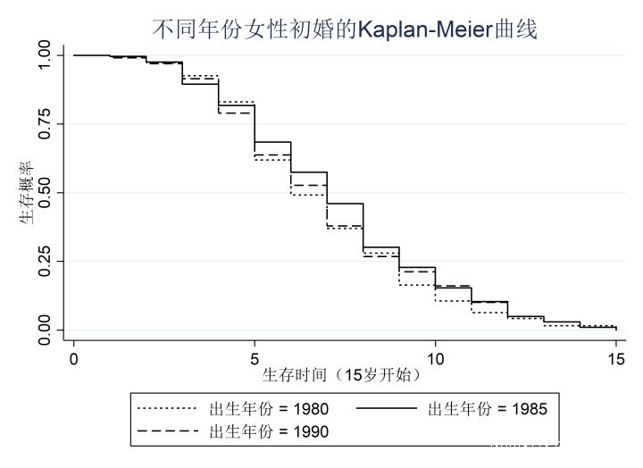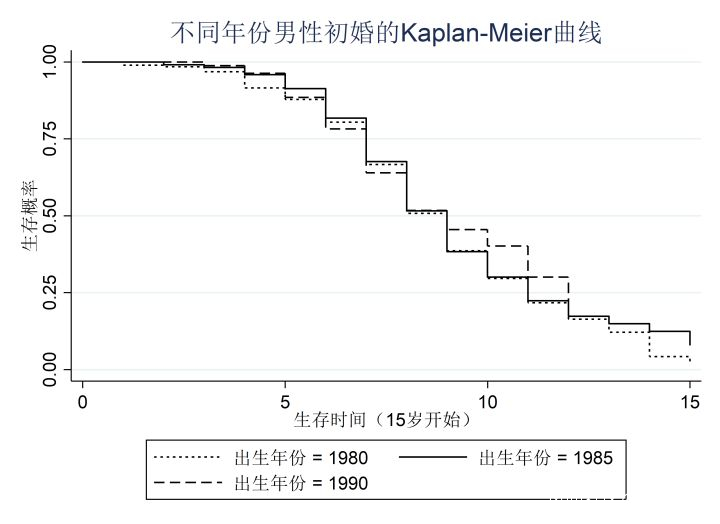 從上圖看,1980年、1985年和1990年出生的男性與女性,他們的結婚概率有什麼差別嗎?1990年的生存曲線,有顯著高於1980年的生存曲線嗎?(生存曲線越高代表同樣的年齡結婚概率越低)