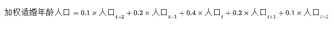 其次,把每個地區的年齡上下2歲,總共5個年齡段,按照下式加權,其中 為當地平均初婚年齡:
