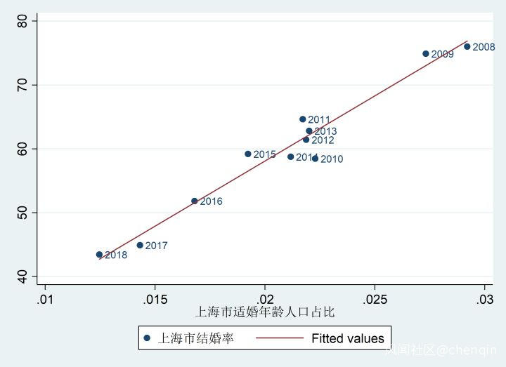 再看明細數據,從2008年到2018年,上海的結婚率是從76‰下降到44‰,下降幅度是43%,而加權的適婚年齡佔比是從2.9%下降到1.2%,下降幅度是57%。