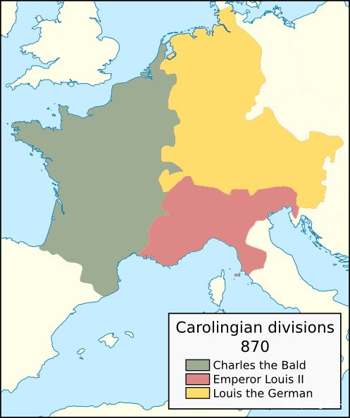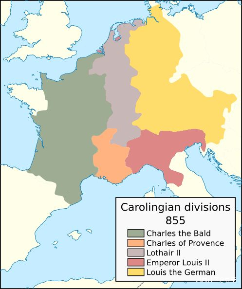 查理一死,仨兒子又商量着分家。他仨打來打去,最終決定分家產這種事還是得籤合同定下來,於是搞了個《凡爾登條約》,把法蘭克分成了東、西、中三國。