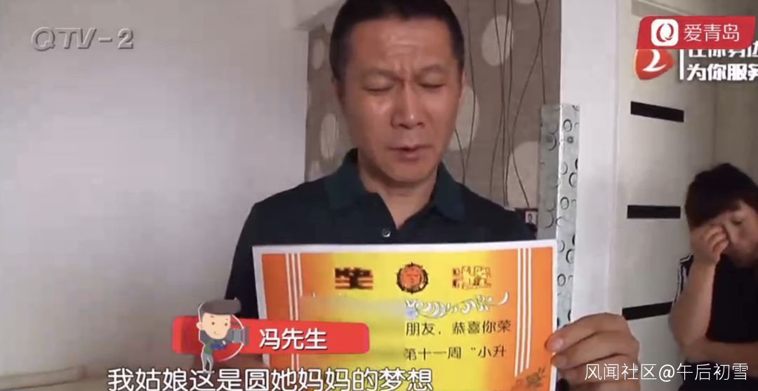 手裏拿着女兒在5月6日獲得的“小升旗手”獎狀,馮先生泣不成聲。