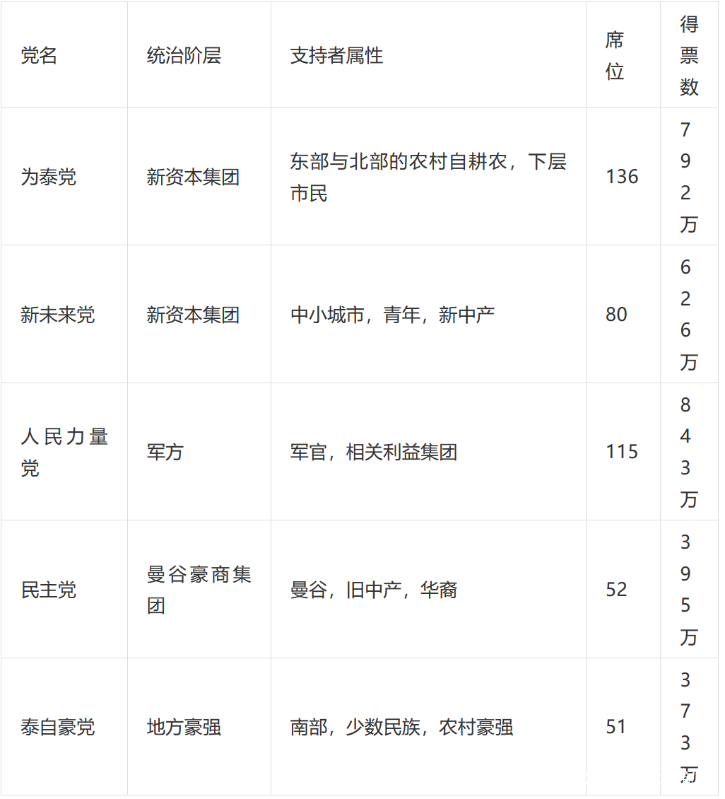 本次選舉中,排名前五的黨派是為泰黨,人民力量黨,新未來黨,民主黨,泰自豪黨,剛好代表了泰國曾經組閣的五種勢力,現根據時間順序整理如下: