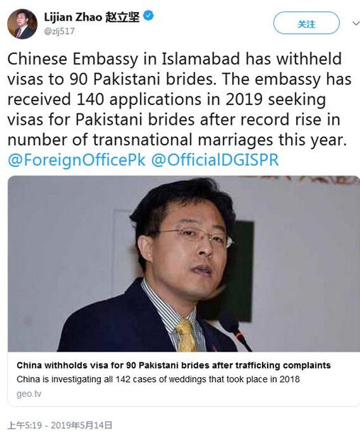 巴基斯坦GEO新聞網14日也報道了此事。GEO在報道中提到,據趙立堅介紹,2018年共有142名巴基斯坦婦女在與中國公民結婚後申請了此類簽證。