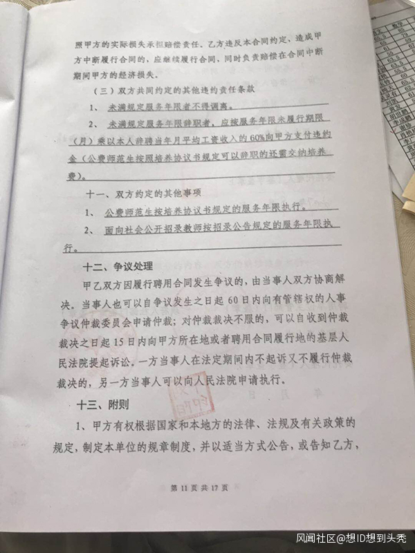 合同第十、十一條還規定,未滿規定服務年限者不得調離;未滿規定服務年限辭職者,應按服務年限未履行期限(月)乘以本人辭聘當年月平均工資收入約60%向甲方支付違約金。此外,公費師範生按培養協議規定的服務年限執行;面向社會公開招錄教師按招錄公告規定的服務年限執行。合同最後有甲乙雙方簽字及縣教育局、縣人社部門蓋章。