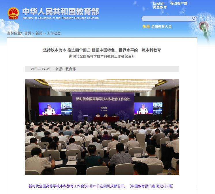 會上,教育部部長陳寶生強調,全戰線都要樹立這樣的理念:不抓本科教育的高校是不合格的高校、不重視本科教育的校長是不合格的校長、不參與本科教學的教授是不合格的教授。一定要把本科教育放在人才培養體系的核心地位、一定要把本科教育放在教育教學的基礎地位、一定要把本科教育放在新時代教育發展的前沿地位。