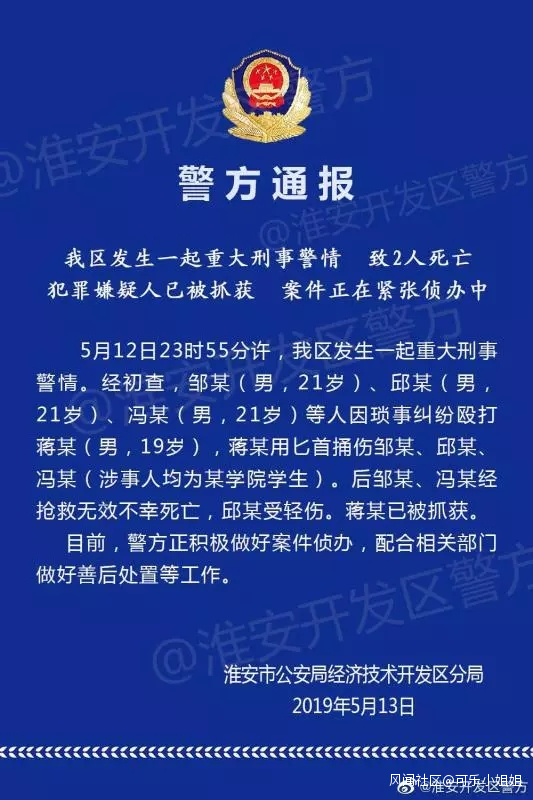 據通報,5月12日23時55分許,淮安市技術開發區發生一起重大刑事案情。經初查,鄒某(男,21歲)、邱某(男,21歲)、馮某(男,21歲)等人因瑣事糾紛毆打蔣某(男,19歲),蔣某用匕首捅傷鄒某、邱某、馮某(涉事人均為某學院學生)。後鄒某、馮某經搶救無效不幸死亡,邱某受輕傷。蔣某已被抓獲。
