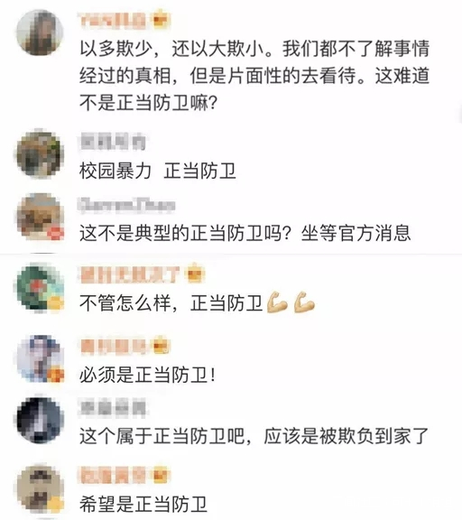 其中,有網友認為,鄒某、邱某、馮某等人以大欺小,以多欺少,導致蔣某隻能選擇反抗,應當認定為正當防衞。