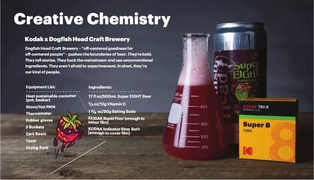 不僅如此,最近還勾搭上了精釀啤酒品牌“角頭鯊 Dogfish Head” ,推出一款可飲用、也可以用來沖洗膠片的 Super Eight 啤酒。
