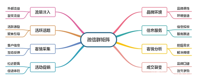 基於微信生態環境的網絡社羣,將微信羣組設定為營銷客户的“主戰場”,並配合公眾平台、營銷微信號,向羣內提供各種促銷與品牌價值提升的信息和服務。在社羣運營的過程中,為保證有效達成運營目標,微信社羣的運營者需要把握住客户的思維模式,保持羣內的活躍度、話題方向、品牌調性,收集客情信息加以分析,再通過各類營銷方法,加強客户對品牌的積極印象,促進營銷轉化契機的產生。