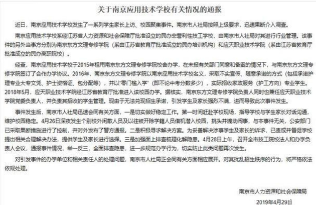 4月29日,南京市人力資源和社會保障局發佈通報,南京市應用技術學校違規承諾、虛假宣傳招生事件暫告一段落。