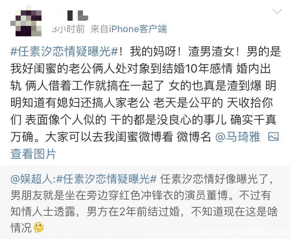 不過在該視頻被曝光後,有網友在社交平台上轉發稱其二人是“渣男渣女”,表示自己的好閨蜜是男方董博的前任妻子,二人在一起長達十幾年時間,任素汐因工作原因與男方相識後插足破壞二人婚姻。