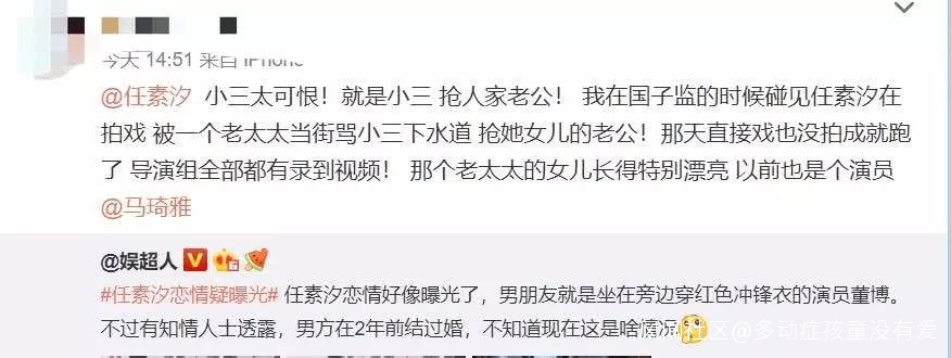 除此之外,也有網友直接點名任素汐是“小三”,並稱任素汐有一次在國子監拍戲時被一位老太太當街指責搶她女兒老公,任素汐直接跑掉,導演組全程目睹事件的發生。