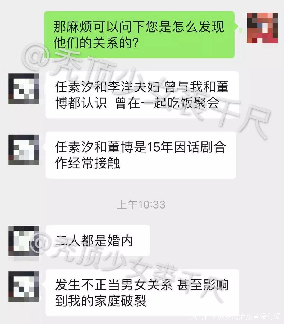 根據前妻描述,董博與任素汐兩人在15年因合作話劇認識後經常接觸,之後婚內出軌,但是對於任素汐目前的婚姻狀態,前妻表示並不清楚。