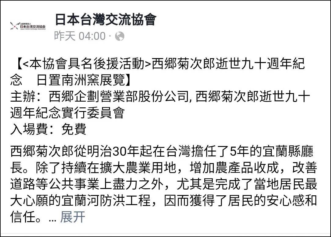 在臉書發文中,日本台灣交流協會大讚西鄉菊次郎治理宜蘭的“功績”: