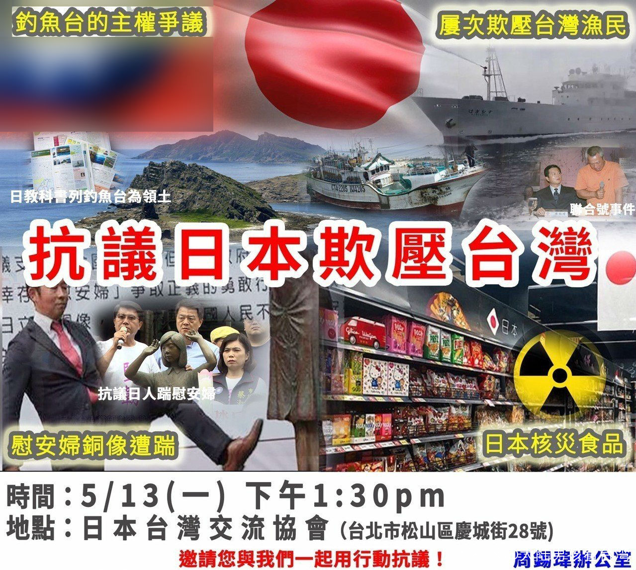 當然,5月13日,前台北縣長、國民黨籍黨員周錫瑋也率支持者到日本台灣交流協會前舉行抗議,指責日本政府與民進黨當局勾結,變本加厲霸凌台灣人民,提出釣魚島主權、“慰安婦”人權、台灣漁民漁權、人民飲食安全等四項議題。