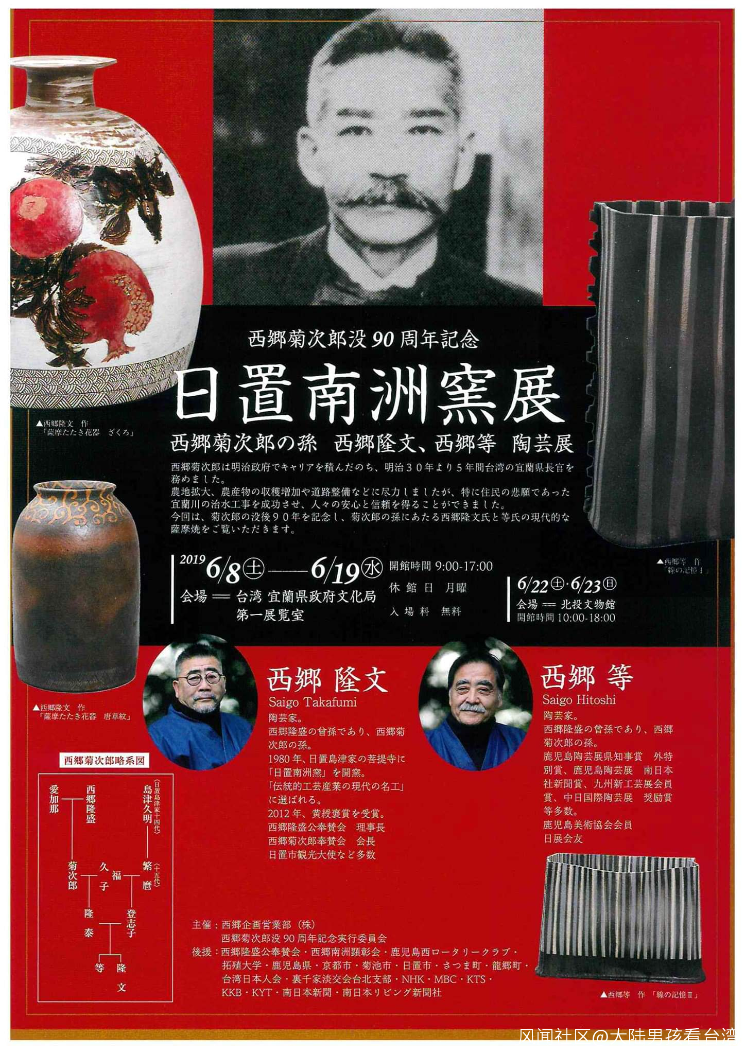 而在日前,日本台灣交流協會又發佈消息稱,西鄉菊次郎的後人西鄉隆文、西鄉等為爺爺舉辦的紀念展將在6月份開展,名稱定為“日置南洲窯展”,具體安排為6月8日至19日在宜蘭縣政府文化局第一展覽室,6月22日至23日在北投文化館。