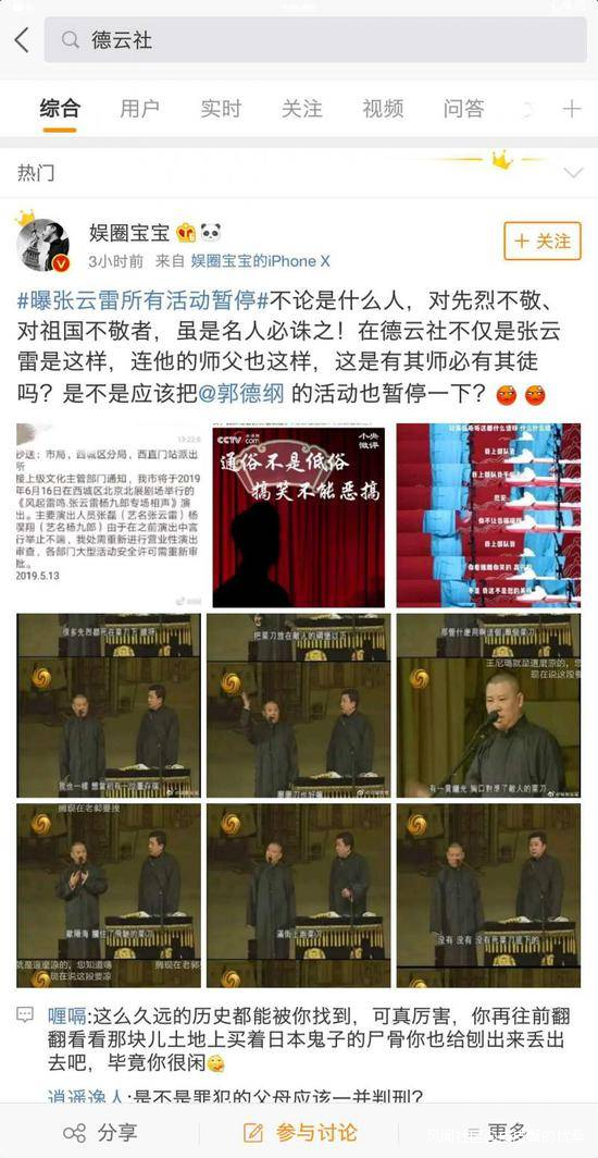 對於上述視頻,微博賬號為“娛樂圈寶寶”的博主在5月13日下午16點04分,發截圖並配發評論稱,“不論是什麼人,對先烈不敬、對祖國不敬者,雖是名人必‘誅’之!在德雲社不僅是張雲雷是這樣,連他的師父也這樣,這是有其師必有其徒嗎?”與此同時,也有網友表示此事發生時間已是十分久遠,似不必再揪住不放。