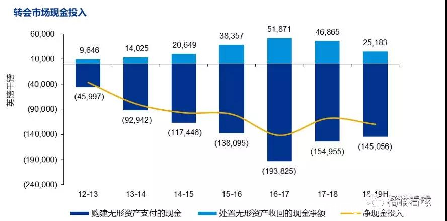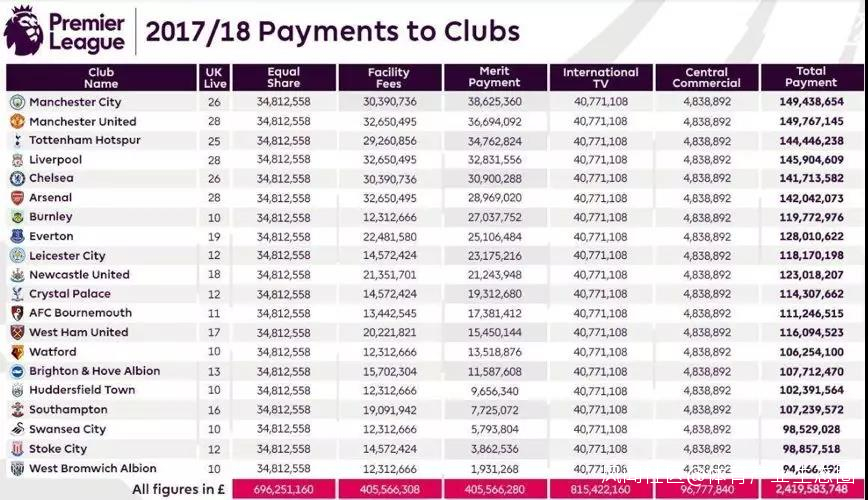 註釋:本週期的轉播分成由UK Live(在英國轉播的次數)、Equal Share(轉播平均分紅)、Facility Fees(按轉播場次來分紅,被轉播得越多,收入越多)、Merit Payment(英超排名獎金,名次越高,收入越多)、Overseas TV(海外轉播平均分紅)以及Central Commercial(核心商業廣告平均分紅)決定。