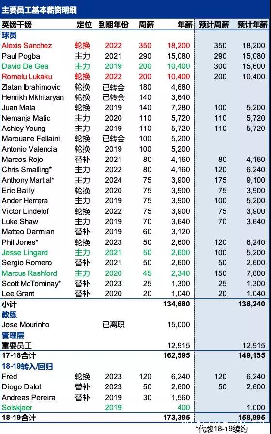 15-16至17-18賽季,曼聯保持了每年約3,000萬英鎊的薪金增長額,先後簽下了施魏因施泰格、博格巴、姆希塔良、伊布拉希莫維奇、盧卡庫、馬蒂奇、桑切斯這些週薪超過10萬英鎊(年薪520萬英鎊)的球員,也加薪續約了德赫亞這樣的中流砥柱。