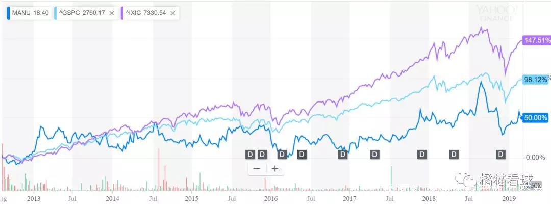 上圖中的深藍、淺藍和紫色折線分別代表了曼聯自上市以來的股價與標準普爾、納斯達克指數的走勢。可以看到2013年底曼聯的股價開始低於大盤走勢,七年來標準普爾和納斯達克指數分佈上升了98%和148%,而曼聯的股價只上升了50%,