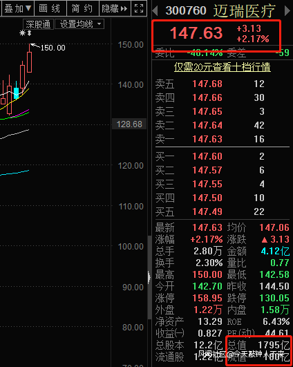 邁瑞醫療2018年10月16日上市,昨天(5月13日)的收盤價147.63元/股。計算一下,100股的市值就是14763元,對於大部分的投資者來説都應該算是不少的了。