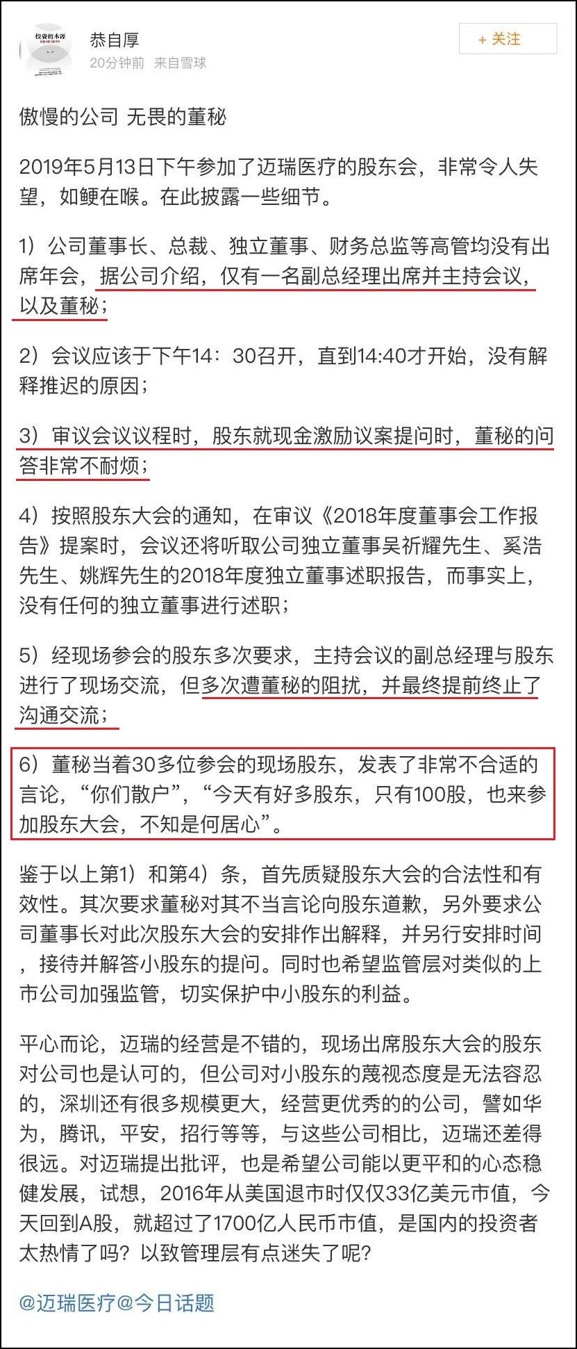 據瞭解,網友@恭自厚 昨晚8時許在雪球平台上發帖分享自己下午參加邁瑞醫療股東會的經歷。在其看來,此次股東會的合法性和有效性值得質疑,公司董秘的表現也極不專業。