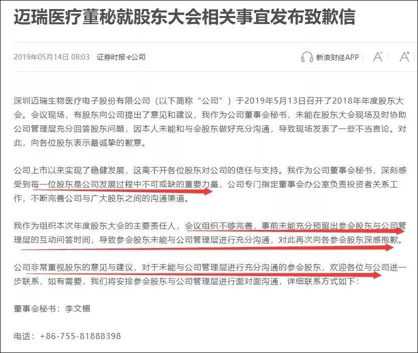 目前,邁瑞醫療董事會秘書李文楣已發佈致歉信稱,非常重視股東的意見與建議,歡迎股東與公司進一步聯繫。