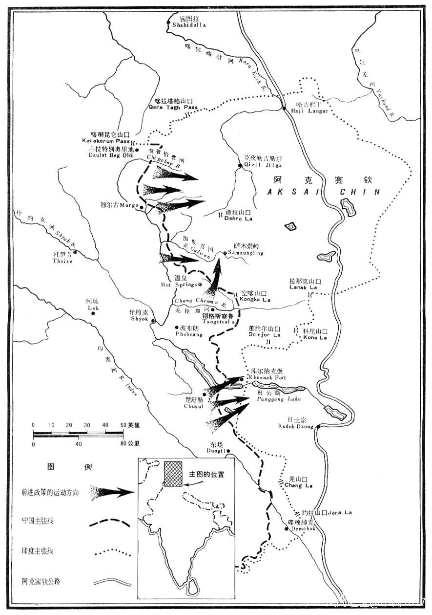 這時,前進政策也開始不聲不響地推行。印度設立了若干居高臨下控制着中國陣地的小哨所,有的就設在中國陣地後面的小路或公路的兩側。參謀局的理論是:這樣就會切斷中國交通線,迫使中國最後不得不撤出他們的哨所。反映印度官員和參謀局人員當時意見的印度報紙和新德里的外國記者,在年初就預言陸軍不久將採取步驟迫使中國撤出阿克賽欽。