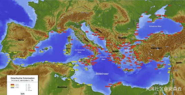 就這樣,希臘人也逐漸開始了和腓尼基人一樣的航海征途,不過比起腓尼基人以商貿為主的地中海南線,希臘人主要目的是獲得更好的農耕地盤,在航海上也是見好就收,開着船到處飄,打一槍換一個地方。