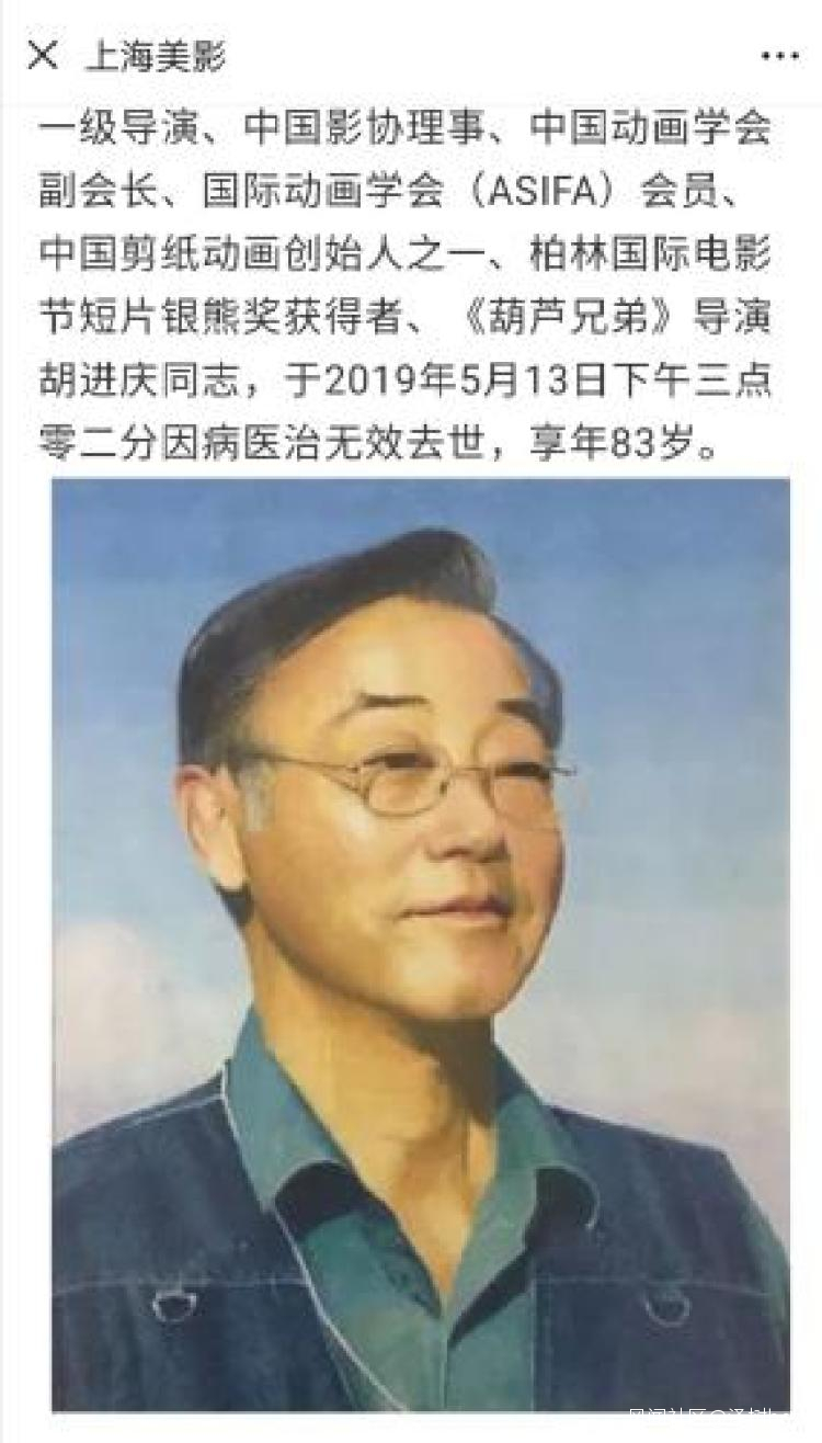 據上海美術電影製片廠消息,13日下午三點零二分,“葫蘆娃之父”胡進慶因病醫治無效去世,享年83歲。